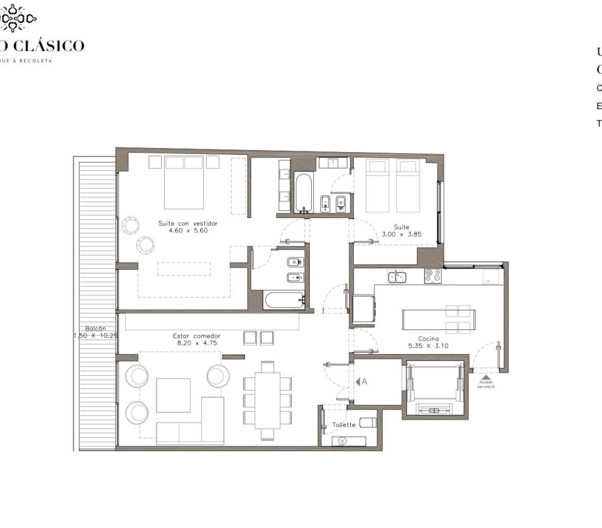 Departamento en venta ubicado en el 8º piso. Callao Clásico, es un emprendimiento residencial inmejorable en el corazón de Recoleta, sobre Avenida Callao entre las exclusivas avenidas Alvear y Quintana. Rodeado de grandes plazas y con un marco cultural y gastronómico de primer nivel. Unidad de 146,59m2 Palier privado, hall de entrada Living comedor de 8,20m x 3,15m. Toilette Cocina de 5,35m x 3,10m. Con comedor diario Master suite de 4,90m x 3,15m Suite Junior 1 de 4,45m x 3,95m Suite Junior 2 de 3,00m x 3,85m Balcón corrido 10,20m x 1,50m El edificio, construido sobre un lote de 833 m2 con 25 metros de frente, con servicios Premium, lucirá una fachada en estilo clásico francés combinada con el vidrio de moderno diseño. El espíritu clásico y moderno del proyecto, con diseño del estudio BMA Bodas Miani Anger y Estudio Abramzon, cuenta con 15 plantas y y 4 exclusivos penthouse con vistas a Callao, Libertador y el río. Serán 15 pisos distribuidos en residencias premium con varias tipologías y de superficies amplias. Los departamentos poseen una resolución constructiva que conjuga los adelantos tecnológicos y de equipamiento de mayor confort con terminaciones y detalles en materiales nobles y tradicionales como el mármol, la madera, el bronce y el hierro. Sobre la fachada clásica del Petit Hotel se encuentran los dúplex de 2 y 3 ambientes con superficies de 85 m2 y 155 m2 respectivamente. Luego el edificio desarrolla una fachada moderna donde se encuentran las unidades de 2 ambientes, 3 ambientes con o sin dependencia de servicio y 4 ambientes con dependencia de servicio, todos con una excelente distribución y superficies amplias. Características generales: Pisos de porcelanato o cerámica de primera calidad en baños y cocina Cocina equipada con mesada de mármol, doble bacha de acero inoxidable horno eléctrico y muebles bajo mesada. Baños con revestimiento en mármol esmaltado, sanitarios marca Ferrum o similar, y grifería FV o similar. Calefacción por piso radiante eléctrico, sectorizado. Agua caliente central Aberturas con DVH (doble vidrio con cámara de aire). 4 ascensores principales y 1 de servicio de gran porte Amenities: Gimnasio de última generación Pileta climatizada de 21 x 5 m. Solarium. SUM completo con salida a terraza exterior Sauna, vestuarios, baño finlandes, ducha escocesa Cava de vinos privados Conserjería, Valet parking y car wash para las cocheras privadas ubicadas en el subsuelo Seguridad 24 hs. La información contenida en el presente aviso es meramente a título informativo. Las medidas y superficies son aproximadas y no resultan vinculantes. Los datos definitivos son los que surgen del título de propiedad. Los montos de expensas, tasas e impuestos deben ser confirmados ya que dependen de la fecha en la que se obtuvo la información. El valor indicado en el presente puede ser modificado sin previo aviso. En relación a las unidades en proceso de construcción y/o a estrenar, se deja constancia que todo lo referido a proyectos nuevos y/o de pozo, las superficies expresadas poseen m2 de amenities y no pueden ser consideradas como definitivas. Las fechas de posesión son estimativas y pueden ser reprogramadas por parte de la dirección de obra del proyecto. Venta supeditada al cumplimiento por parte del propietario de los requisitos de la resolución general nº 2371 de la Afip (pedido de COTI). Corredora Inmobiliaria y Martillera Publica responsable CMCPSI 5048 / CUCICBA 5010.