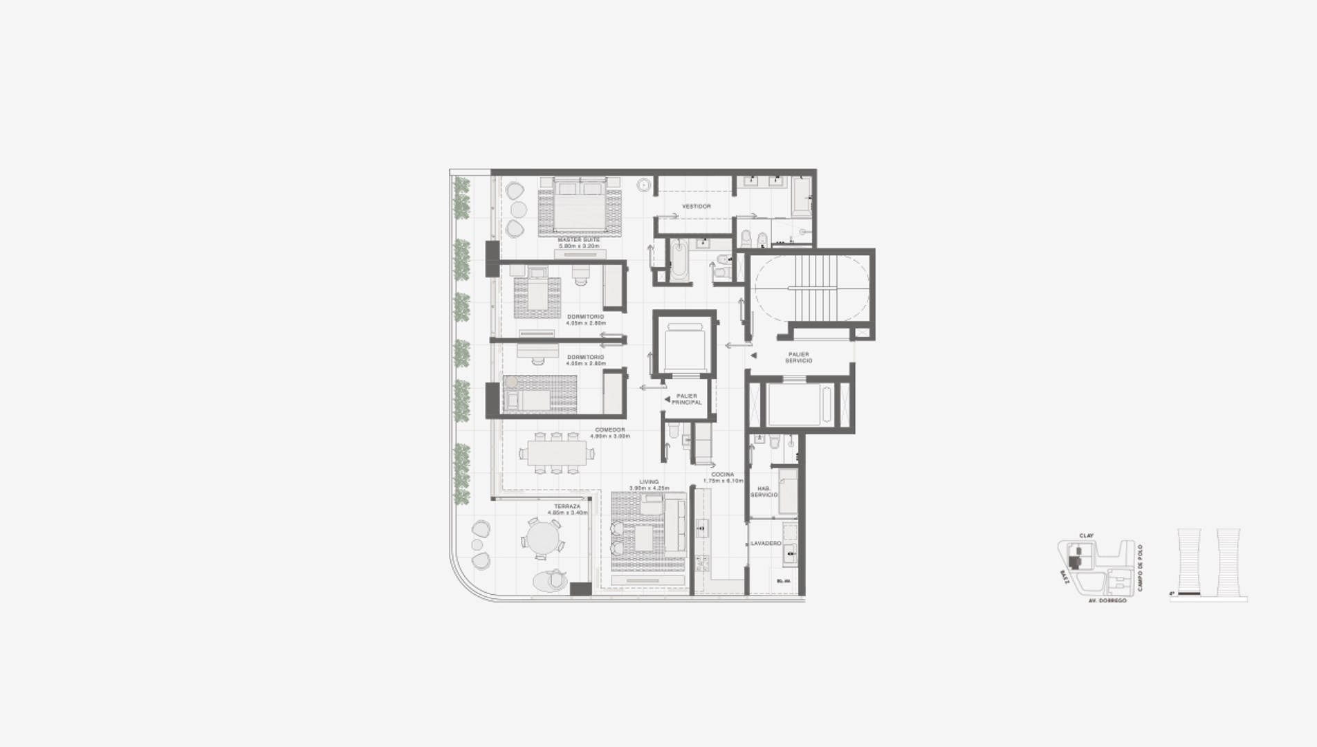 Dos torres al rio, campo de polo ,hipódromo y la cuidad emergen para cambiar el concepto de lujo y exclusividad. Residencia exclusiva que se ubica en el piso 5 de la Torre Sur. Posee un Hall de distribución . Toilet. Living y comedor con grandes ventanales y vistas panorámicas. Suite Principal con vestidor y baño completo. 2 Suite junior. Cocina integrada con isla y dependencia de servicio. Además cuanta con 2 cocheras. Un desarrollo innovador, donde armonizan el estilo y la elegancia. Líneas rectas conviven con materiales nobles y un entorno natural hacen que Deco Polo sea un proyecto único. Amenities: Amplios espacios comunes que se dividen en diversas zonas de esparcimiento, diseñados con materiales nobles y colores sutiles, generando ambientes luminosos y abiertos para disfrutar en todo momento.